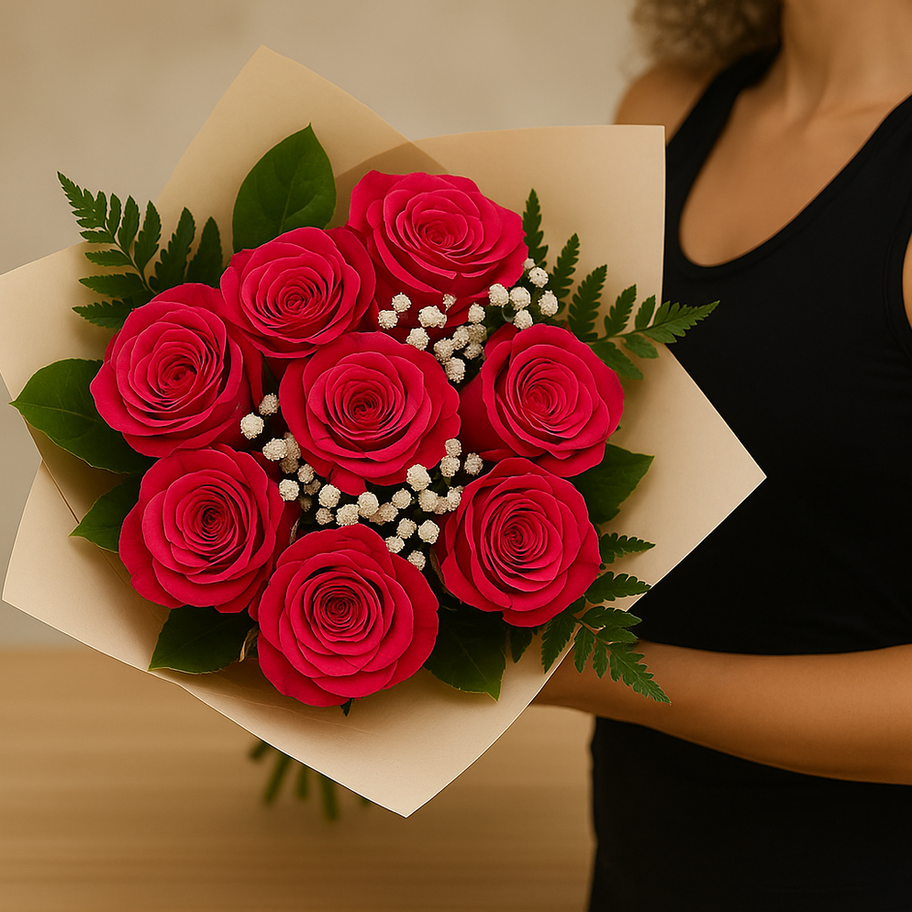 This stunning bouquet of red roses symbolizes love, beauty, and devotion. Perfect for anniversaries, Valentine’s Day, or to show someone how much they mean to you.