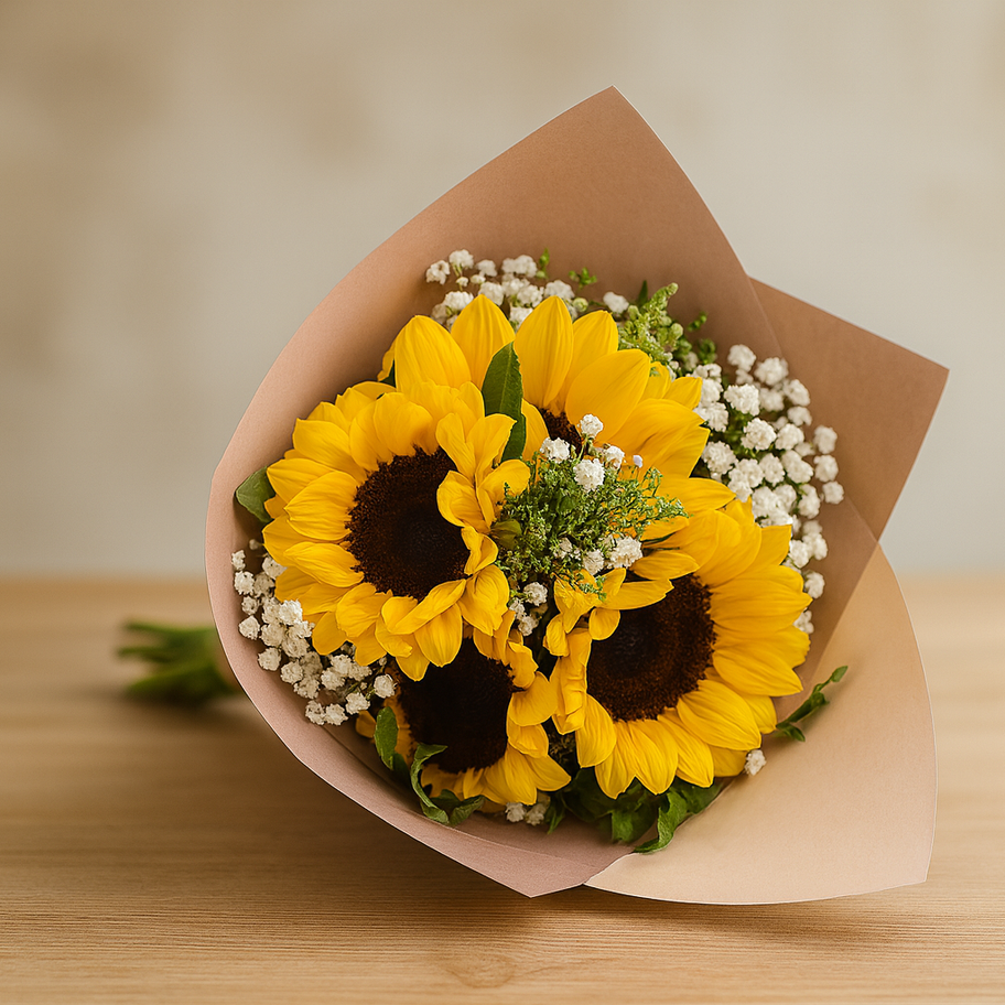 Fresh sunflowers paired with soft white baby’s breath create a timeless and cheerful look. Great for birthdays, graduations, housewarmings, or brightening someone’s mood.