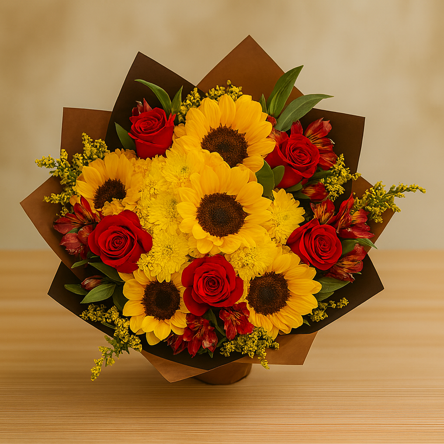Bright and bold, this bouquet features golden sunflowers paired with classic red roses for a warm, joyful look. Perfect for birthdays, anniversaries, or “just because” moments, it brings instant happiness to any space. Hand-wrapped with care, this radiant mix symbolizes love, positivity, and celebration.